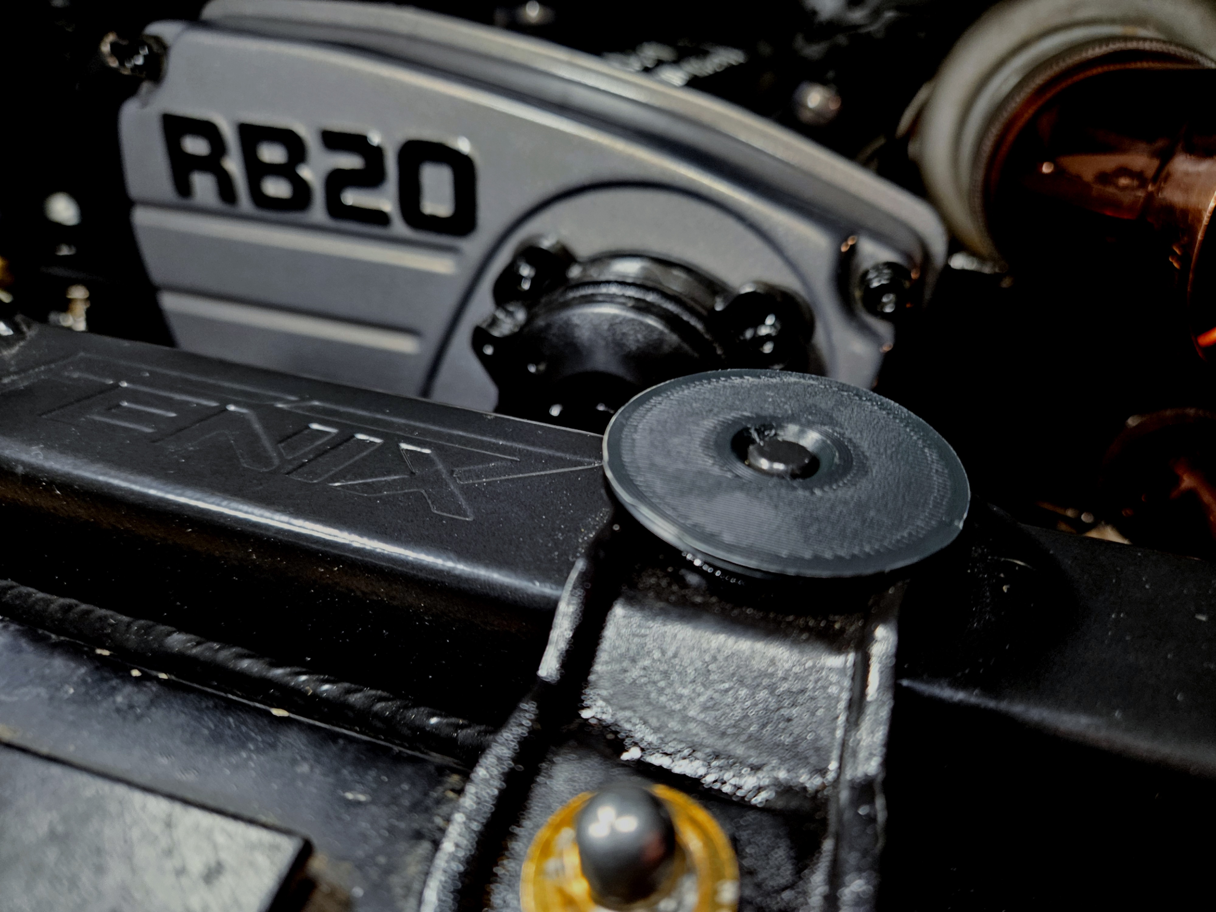 Solid radiator post bushes on this RB20 R32 Skyline GTS-T. Tidies up the engine bay nicely, and replaces the original rubber bushes that have usually disintegrated by now.
